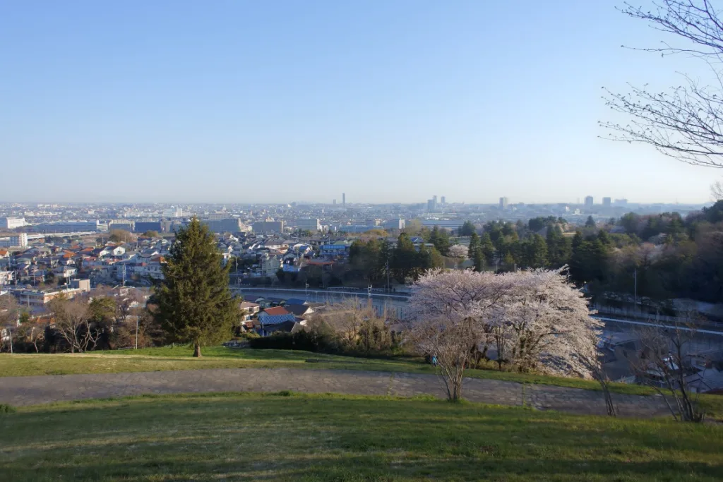 ゆうひの丘からの風景です。 桜が咲き始めて一週間経過しましたが、まだ満開になりません。