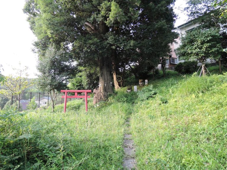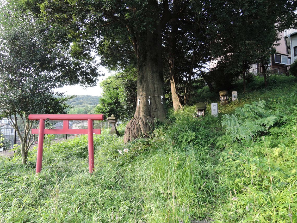 根本に赤い鳥居と右側には2つの祠。<br />