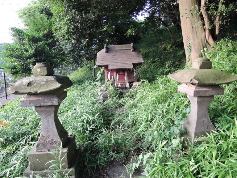大きめの祠の前に灯籠が2つあります。<br />