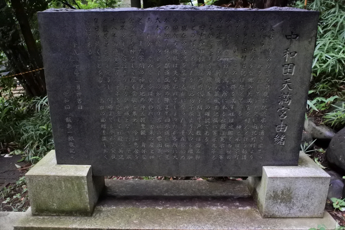 旧中和田村は江戸時代末期まで戸数は拾五軒ほどの村であったが明治初年頃より人口も増加し現在の活況を呈する様になった。平成の初めの頃か古棟札は失われてしまったが各所に大木の切株や都道改修の際まで旧参道に埋めの老大木が緑のトンネルの如く茂り古社の雰囲気であったが、その姿も今は失われ、古来の産土神とし、また学問の神天地の神五穀豊穣、身体安全の守り神として広く崇敬を集め、今は鳥居を結界として石段より上方が神域となった。平成十八年御鎮座三百八十年を記念して社殿の再建と覆屋の改修も完了し、何時までも平和で安穏な日の続くことを希い、当社の由緒を識しおく。