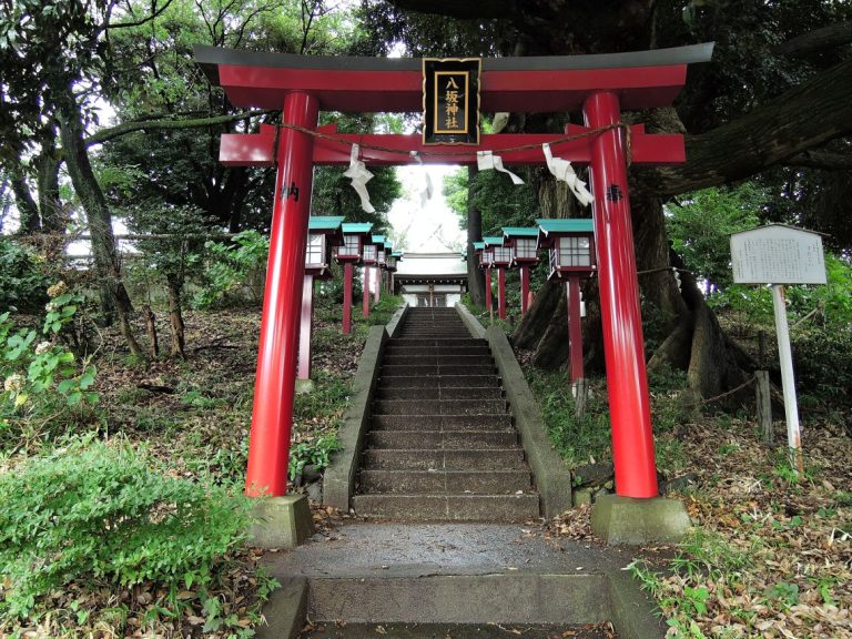坂の途中に鳥居があり、さらにその先に赤い灯籠がいくつか。<br />